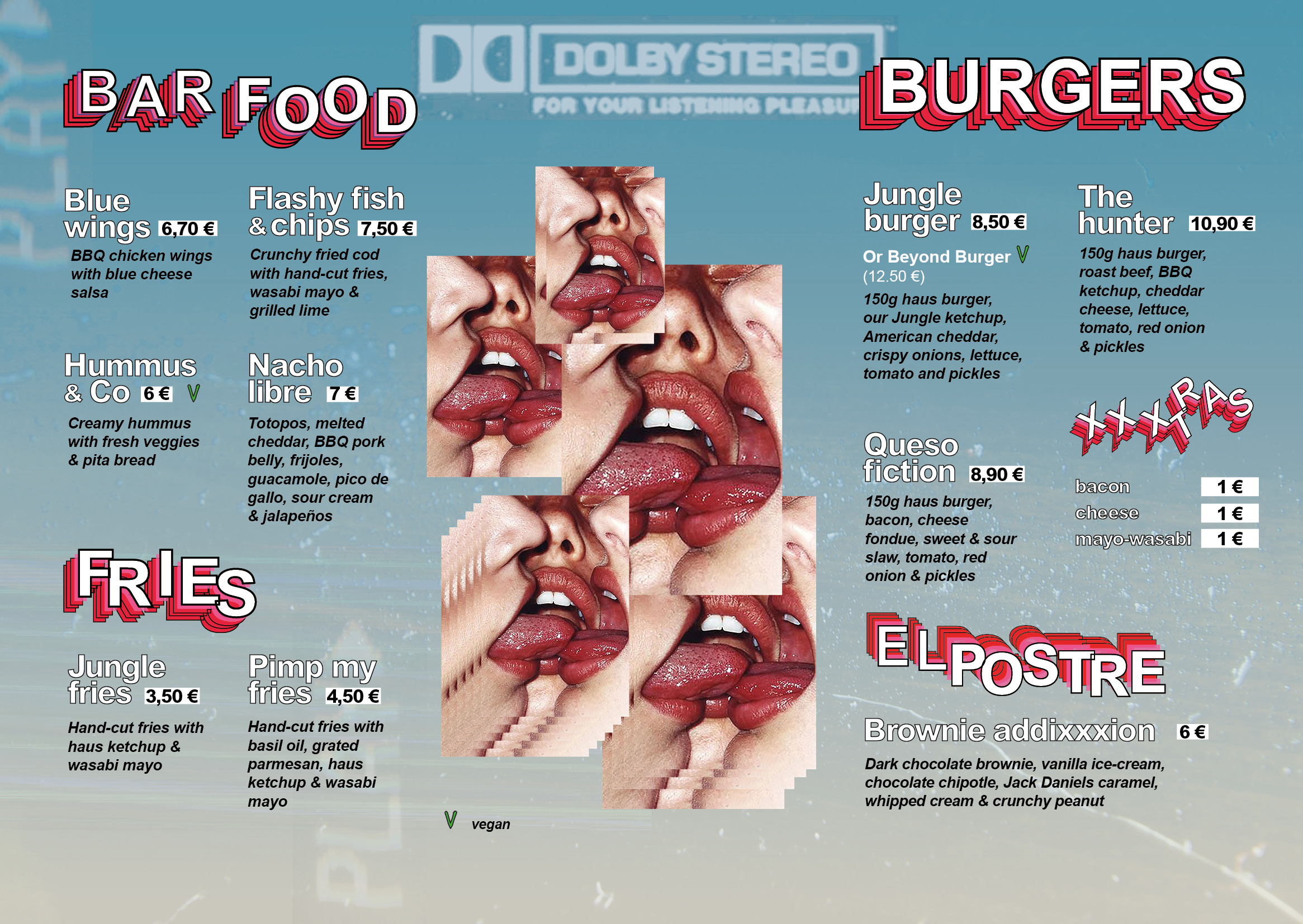 Blue wings, Flash fish & chips, nachos, hummus, hunter burger, vegan burger, fondue burger... and unusual fries.